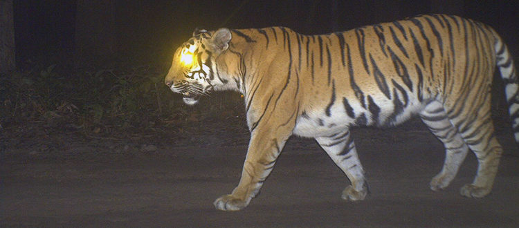 No sooner had I thought this than Karam Singh, our Field Assistant, whispered: “Wahan kuch to hai! Thoda piche lo” (There’s something there! Reverse a bit!). We reversed, and lo! We saw two red spots aglow in the undergrowth and then a full-grown tiger came into view! No more than six feet from our vehicle, emerging between two thick sal (Shorea robusta) trees, it seemed for some reason quite tolerant of our presence. Lit up under the headlights the tiger presented itself in its full glory for that sought-after ‘trophy photo’. I raised my camera and saw the picture I was about to click through its viewfinder. The infra-red focus lights seemed to catch the tiger’s attention (despite the blazing headlights), however, and it turned its head away. With a brief second thought I lowered the camera, giving up on that ‘once in a lifetime’ photograph. The tiger eased and stood watching us with what seemed to be a questioning gaze. ‘What do you want here, in my home?’ it seemed to say; ‘I’m hungry and have to leave for a hunt’.