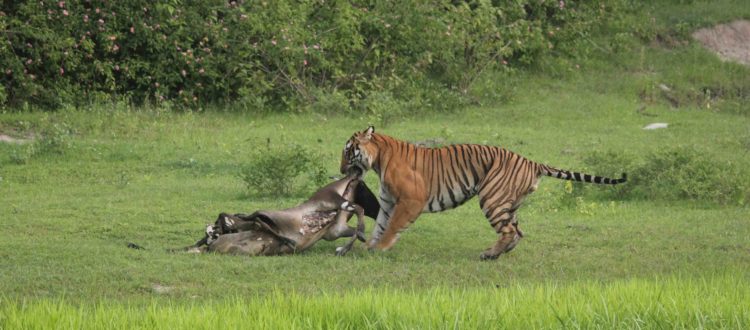 Remember that these protected areas are not fenced or walled. They cannot be, as we also need tigers moving between two tiger reserves to ensure that there is less inbreeding, and moreover, the borders are so convoluted it would be a very costly affair to build and maintain these fences. Many of the edges blend continuously from forests into agricultural fields, and a lot of the agriculture to tigers appear as nice lush grasslands. So many young adult tigers often settle down in such edges, with the best of both worlds! Or so it seems! Many agricultural landscapes beside forests also harbour wild prey populations of nilgai (Bocephalus tragocamelus), hog deer (Axis porcinus), wild pigs (Sus scrofa) etc., and many edge dwelling tigers survive of these, most of the time. Some also start picking off a small calf or two, when opportunity provides for. And some unfortunate ones are either spotted by humans or accidentally pounce on a crouching or squatting human. Once either of this has happened, what we call as ‘human-tiger conflict’ has erupted, and the situation transcends to a new dimension altogether.