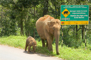 In the Thirunelli-Kudrakote corridor of Wayanad, Kerala, a wild elephant and her young calf one stand next to a sign that says it all.