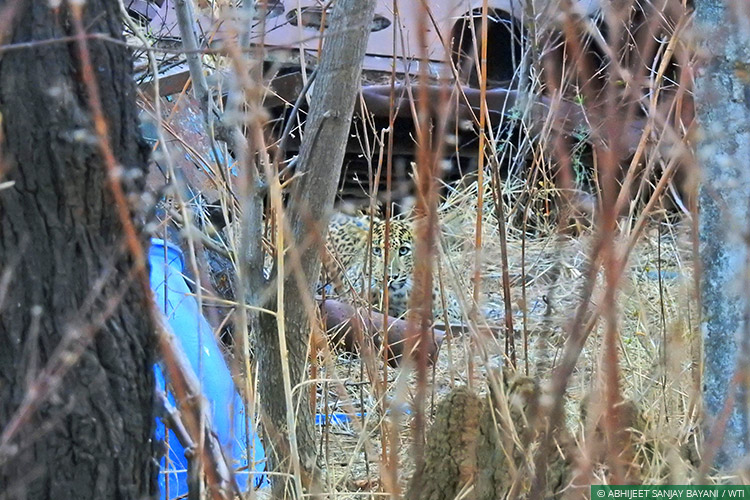 Nikhil and I had read previously how camouflage and adaptability are the keys to the common leopard’s success as a stealth predator across varied habitats in India. This leopardess and her progeny had given us a live demo of this notion, having taken up residence in a junkyard full of scrap metal.