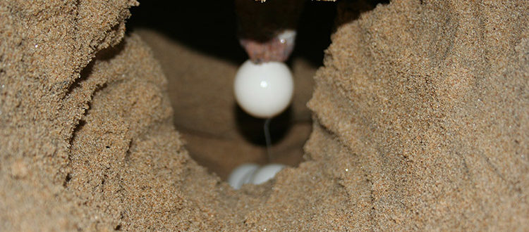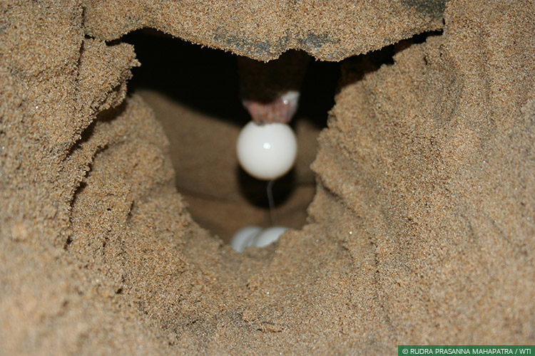 The eggs are laid in conical nests about a foot-and-a-half deep, which the females laboriously dig with their hind flippers. After the last egg is dropped they carefully cover up the nests with sand, their rapid movements resembling those of a professional tap-dancer. Some 45 to 60 days later the eggs begin to hatch and the beaches are swamped with crawling turtle babies, braving predators like jackals, birds, hyenas, fiddler crabs and feral dogs in their first trek towards the vast ocean.