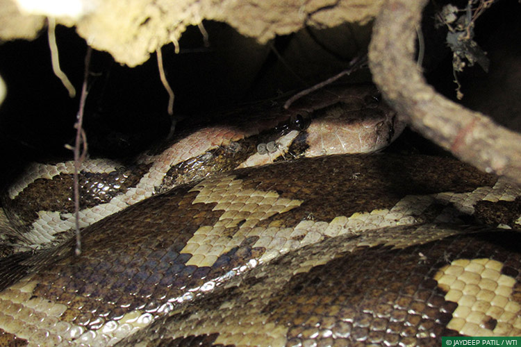 I told them that I work with WTI; that I was there only to identify the snake and assess if there was a threat. Suddenly, I heard the same growling voice say, “Sir, there is no ‘saanp’ (snake) here but there is one ‘ajgar’ (python).” My heart skipped a beat at this point. “Have you seen it? Where?” I asked, to which they pointed at a large Babul tree behind them. I stared at the tree and noticed a peculiar detail: there was a large, rounded fencing of thorny branches at its base. As I walked towards the tree I realised I was being accompanied by almost half the people at the pond. They helped me move the four-feet-tall wall of thorns aside. I could see a big hollow underneath the tree. And there it was; some seven feet of raw power coiled up in the hollow. I watched it with utter joy and awe. There was something white beside it. It looked like a crumpled piece of paper. I took a closer look inside the hollow and realised that it was an egg. The python was a she. And she was coiled up around her eggs. I could see her contracting her muscles to produce the heat required for incubation.