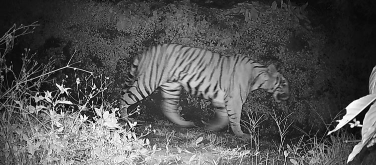 Our team assisted the Forest Department in setting up 27 camera traps (CTs) in the locations where the tiger pugmarks were seen and also in the areas where cattle and dog lifts had occurred. Furthermore, the placement of the camera traps was adjusted based on the presumed movement patterns of the tiger and reported incidents. The camera traps were checked on a daily basis and their data were regularly updated.
