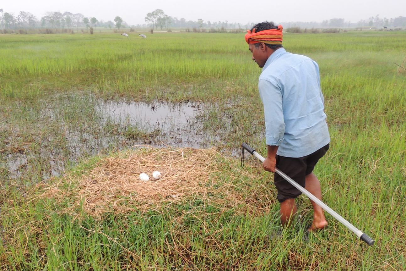 A Sarus Mitra volunteer, monitoring a nest at the Chiraiyakot wetland | Photo by Arshad Hussain/WTI