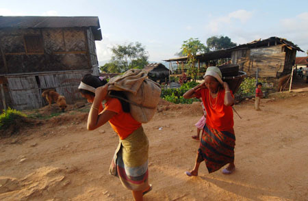 Beneficiaries carry home the grain provided by WTI.