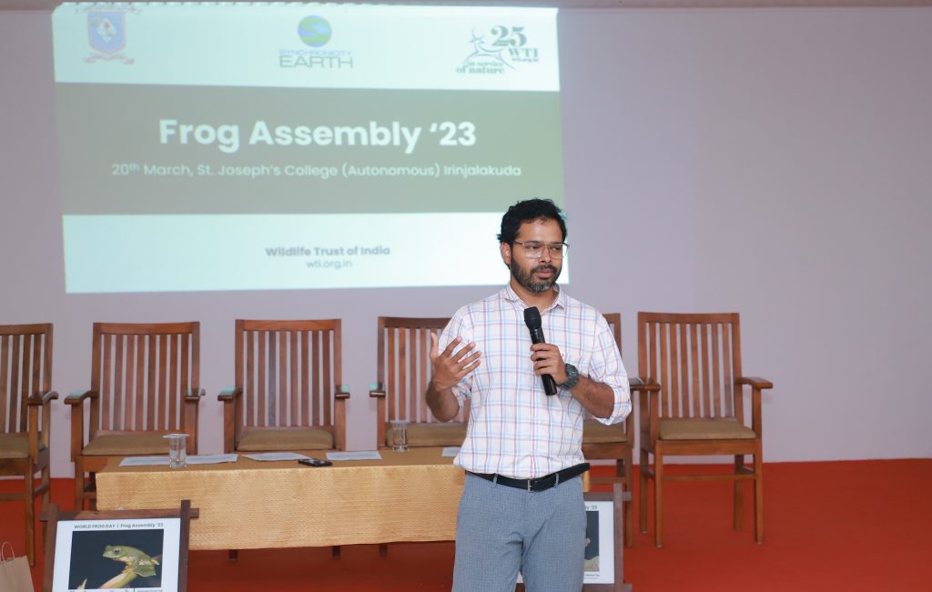 Irinjalakuda, 20th March, 2023: Wildlife Trust of India celebrated World Frog Day on March 20th in association with St. Joseph’s college (Autonomous) Irinjalakuda and Synchronicity Earth. The Frog Assembly 2023 was conducted as part of the Amphibian Recovery Project by Wildlife Trust of India for the conservation of Munnar’s endemic frogs. More than 120 students and researchers from Kerala attended the event.