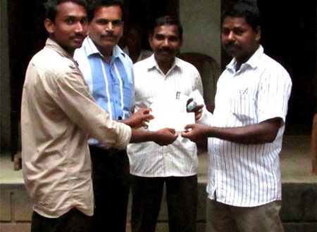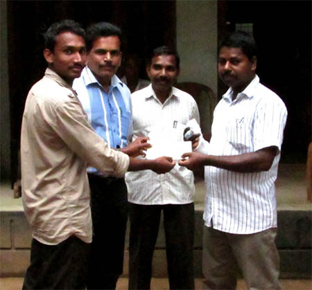Wildlife Trust of India field officer, Ramith M handing over the cheque of 25000 Rs to Mr. V. R. Shaji, Section forest officer in the presence of M Rajan, RFO and Jayachandran, SFO. Photo: IFAW-WTI