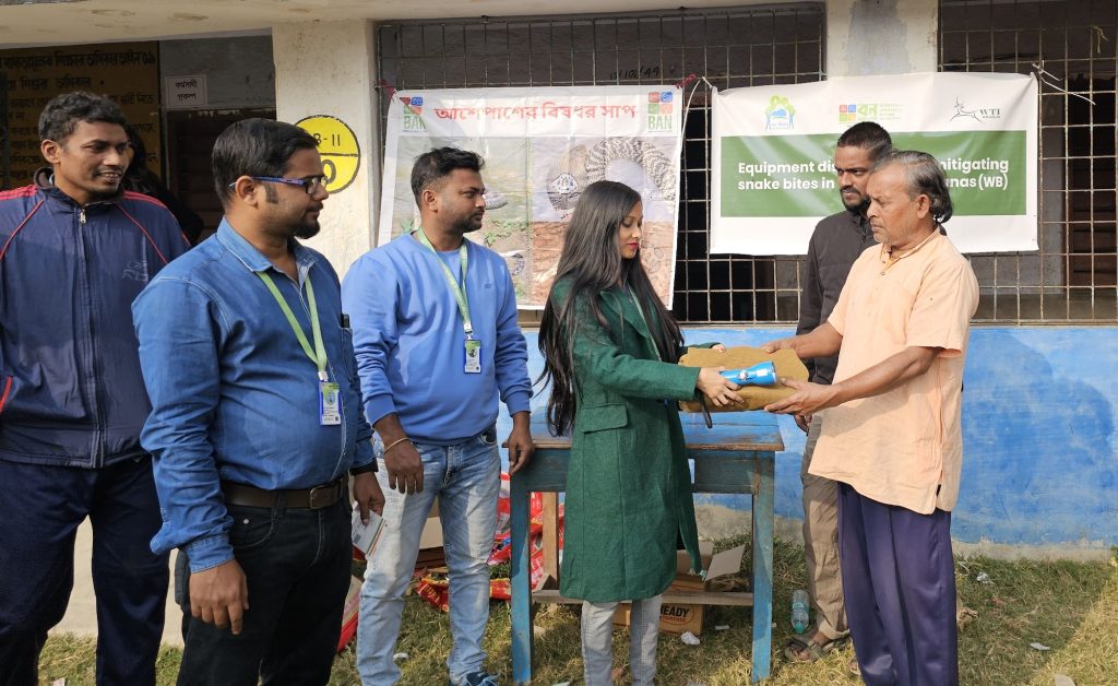 Identifying the issue at hand, BAN reached out to the Wildlife Trust of India (WTI) to provide equipment support to the community, in an effort to mitigate human-snake conflict.; The organisation applied for a RAP (Rapid Action Project) to secure the necessary resources (equipment) for the community members that would enable them to protect themselves when encountering snakes. As a part of this RAP, 200 mosquito nets, 200 torches, and 200 pairs of gumboots were distributed to community members from four panchayats which were the most snakebite prone zones in the area with the most number of fatal attacks. Additionally, awareness programs were conducted by BAN members to educate the community on identifying venomous snakes and preventing snake bite incidents.