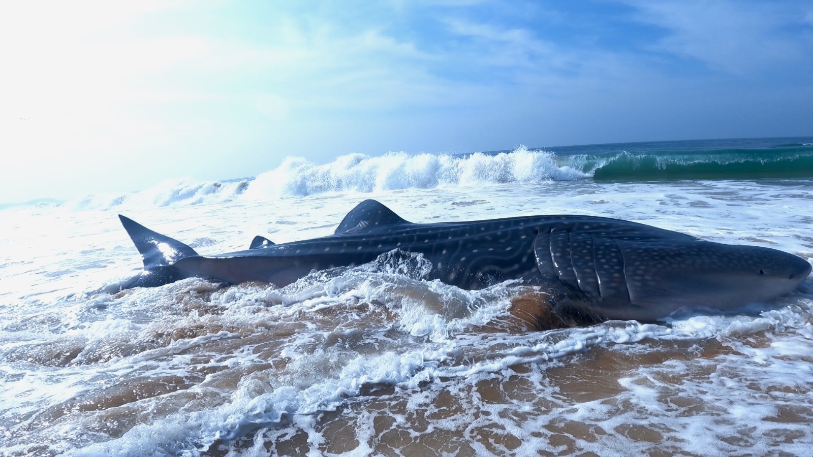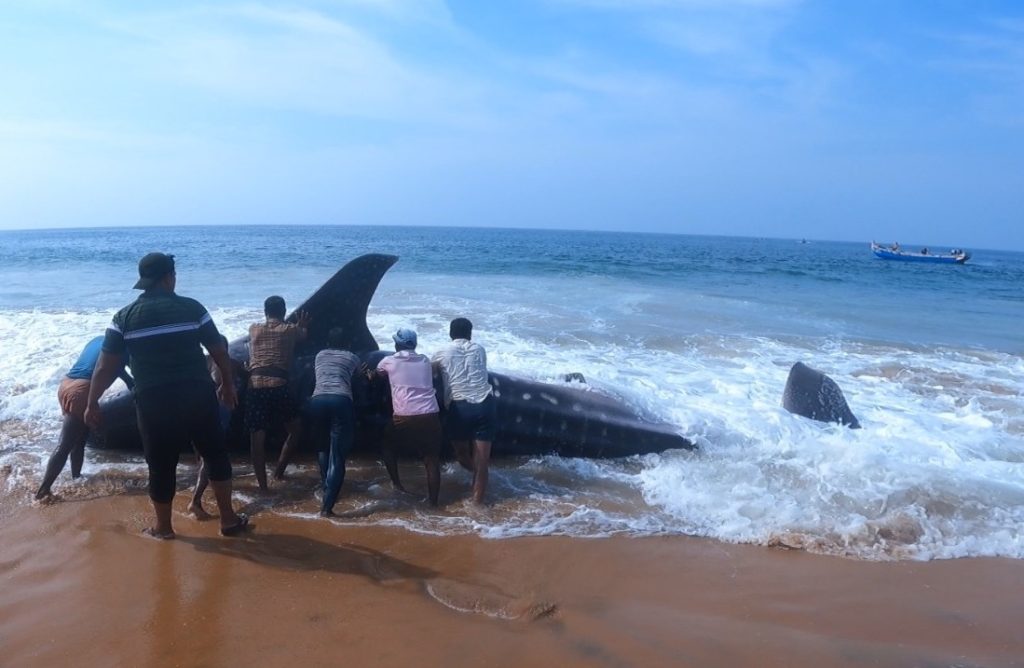 Whale Shark rescued on the coast of Trivandrum being pushed into the ocean by rescuers | Photo by Charan K Paidi/WTI