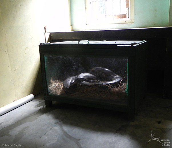 When the MVS team returned to CWRC Dr Ali and lead veterinarian Dr Panjit Basumatary supervised the ideal enrichment of a glass-sided box in which the female python could incubate her clutch of eggs. The box has been positioned in a partitioned room in the Small Animal Nursery. Since the eggs are at an advanced stage of viability, just about five to ten days short of maturity, it is hoped that at least some of them will hatch successfully.