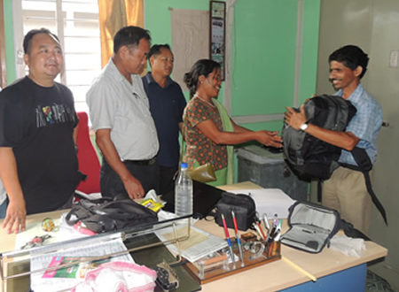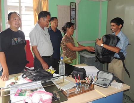(L-R) WTI’s Sunil Kyarong and DFO Tashi Mize stand by as village council member Mrs Bapiyang Tayeng hands out a kit to a forest guard