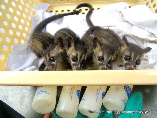 Kaziranga, August 28, 2015: Four common palm civets being hand raised at IFAW-WTI run Centre for Wildlife Rehabilitation and Conservation (CWRC) are ready for the in-situ acclimatisation.