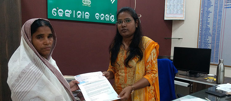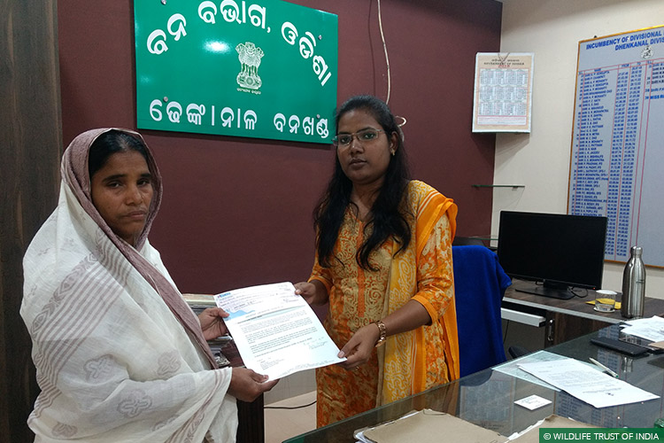 Dhenkenal Forest Division, Odisha: On November 25, 2017, Mr Girish Chandra Biswal was guarding an injured elephant that had taken shelter in a pond near Gatarei village. Due to his advanced age, Mr Biswal was unable to run when the elephant suddenly charged at him, killing him on the spot. On February 6, 2018, Ms Rinku Kumari (IFS), the Divisional Forest Officer of Dhenkanal, presented his wife Mrs Lilyrani Biswal with an ex-gratia cheque of Rs 50,000 in the presence of WTI staff. Mrs Biswal thanked IFAW-WTI for the support and respect shown towards her husband for his dedication to his duty.
