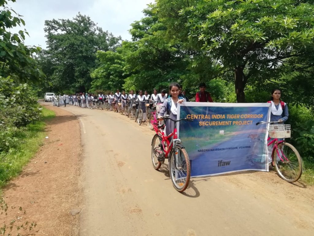 In NNTR corridor, a program was held in M. B. Patel College, Sadak/Arjuni with nature club members and Forest dept. staff on 29th July, 2022. Talk sessions on the ecological importance of large carnivores such as the tiger, and the importance of youth’s role in conservation were organized by Dr. Mahendra B. Raut (Field Officer, WTI). The first session briefed the gathering about the background of Global Tiger Day celebrated to acknowledge international efforts for tiger conservation and provided them the Indian context including the formulation of the Wildlife Protection Act 1972, initiation of Project Tiger in 1973, and the report released by MOEFCC, Government of India on the current status of wild tigers in India. In the second interactive session, engaged students to provide insights about the ways in which they could contribute to the protection of the tiger and its habitat, while also reducing human-wildlife conflict. The students enthusiastically participated in the discussion. A short awareness film on ‘tiger conservation’ and ‘ways to reduce human-wildlife conflict’ in Hindi “Kinara” was screened for the participants, followed by a quiz competition and distribution of book prizes to the winners. In the third session conducted a 12 kilometers “Cyclothon” (cycle rally) from M. B. Patel College Sadak/Arjuni to Baki Gate, NNTR in the corridor to spread awareness among the students and villagers regarding tiger conservation. It was followed by a nature walk for students. Participants observed various flora and fauna while walking around the roadside. A total of 150 students and faculty members of various departments from the same college attended the program, among which professors, Heads of Departments (HoDs) and the college principal were present.