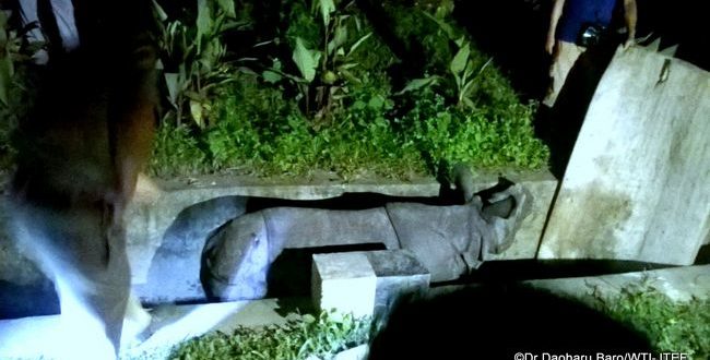 In an attempt to escape from the inundated areas of Kaziranga towards the nearby uplands of the tea estate, the rhino had apparently been confronted by people on the National Highway and the temporary flood relief camp in the area. Chased towards the tea estate, the rhino fell into a five-foot-deep drain in front of the relief camp.
