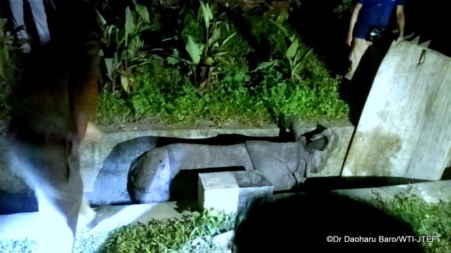 “In consultation with a few local villagers and the Kaziranga DFO we quickly planned the most efficient way of getting the rhino out of the gutter”, said IFAW-WTI’s Dr Bhaskar Choudhury. “Using a soft, thick rubber mat, we blocked its path to the concrete slab so it would not injure itself further. That immediate objective achieved, local residents helped us to construct a sturdy ramp with sliced banana stems and wooden planks. We administered an antibiotic to the rhino as a precaution against infection from its injuries. Then, having tested the ramp for stability, we placed it in front of the rhino in such a manner that it could use it to exit the drain and move uninterrupted towards higher ground.”