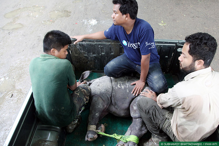 CWRC, Kaziranga National Park, August 14, 2017: Working in concert with a Kaziranga Forest Rescue unit, the Mobile Veterinary Service (MVS) team of the Centre for Wildlife Rehabilitation and Conservation (CWRC) – IFAW-WTI and the Assam Forest Department’s wildlife rescue, treatment and rehabilitation facility near Kaziranga National Park – rescued a stranded female rhino calf, about six months old, from a flood affected village earlier today.