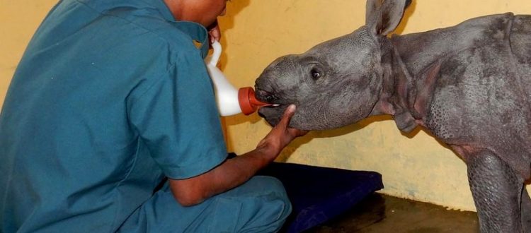 Animal Keeper feeding the newly admitted rhino calf at CWRC