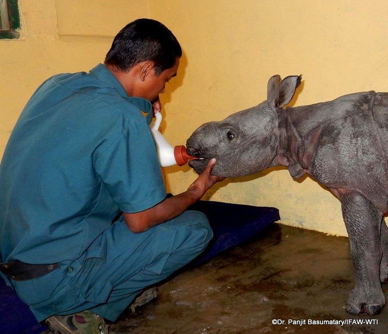 CWRC, Kaziranga National Park, 22 March 2016: A week old male rhino calf rescued by the staff of Bagori forest range of Kaziranga National Park was admitted on Saturday the 19th March to the IFAW-WTI run Centre for Wildlife Rehabilitation and Conservation (CWRC).