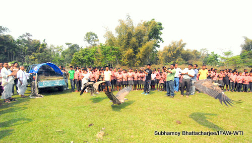 Chengeligaon, Tinsukia, March 13, 2015: The Assam Forest Department decided that nine vultures, who survived poisoning and were rescued from Chengeligaon of Dangori area, under Doomdooma Forest Division (Talap Range), should be released back in to the wild. These raptors were released by the Eastern Assam Mobile Veterinary Service (MVS) unit of International Fund for Animal Welfare and Wildlife Trust of India (IFAW-WTI) today.