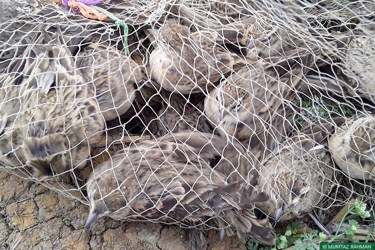 It was found that poachers from Birbhum and Murshidabad would visit the congregation sites of larks during the day when the birds were on crop fields, feeding. They would install mist nets between tall bamboo poles planted into the ground. At nightfall, they would stun and disorient the resting birds using high intensity torches and drive them into the mist nets.