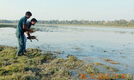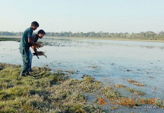 Kaziranga, December 28, 2015: A pair of ruddy shelducks under treatment at the IFAW-WTI run Centre for Wildlife Rehabilitation and Conservation (CWRC) was released in Kaziranga National Park on December 28, 2015. The ducks were released near a water body in Agoratoli forest range of Kaziranga National Park by the IFAW-WTI MVS team led by Dr Biswajit Boruah.