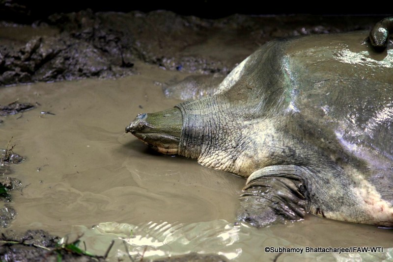 Softshell turtles are found in streams that connect to larger rivers like the Brahmaputra and are often caught up in fishing nets and hooks meant for large fish. The injuries they sustain, while common, do not always come to light because of the illegal trade in softshell species.