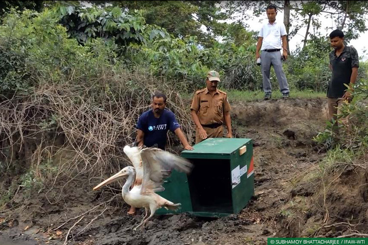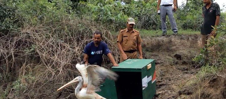CWRC, Kaziranga National Park, August 31, 2017: An injured spot-billed pelican (Pelecanus philippensis) that had been brought to CWRC – the Centre for Wildlife Rehabilitation Conservation; IFAW-WTI and the Assam Forest Department’s wildlife rescue, treatment and rehabilitation facility near Kaziranga National Park – for treatment was released back into the wild yesterday.