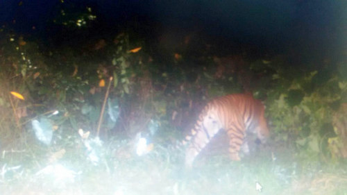 Late night, around 10:50 pm, the tiger appeared and with lightning speed took away the kill, with the observers barely being able to see him for a fraction of a second. One camera trap recorded the visual evidence- a sub-adult male tiger.
