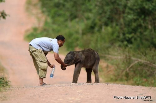 At around 9am, we were informed by a Forest Department patrol team that the mother had been seen around 10 kilometers away. We decided to call it quits by around 10am as a group of poachers had entered the park and killed a chital, causing the RFO and his team to attend to the matter. The CF and RFO instructed that the calf be transferred to Ramapura Elephant Camp and try uniting the calf with a female captive elephant that was mother to a one-month-old. We stayed the night at the camp and tried to unite the calf and female in the morning. Our attempts failed but another female elephant, ‘Padmavati’, bonded with the calf and adopted him. We started feeding him Lactogen mixed with Glucose and ORS, which he drank readily. We had to leave the camp to deal with a monkey case in Hangala village. The calf was left in the care of the mahouts of the camp who promised to feed the calf according to the feeding schedule given by me and take care of him.