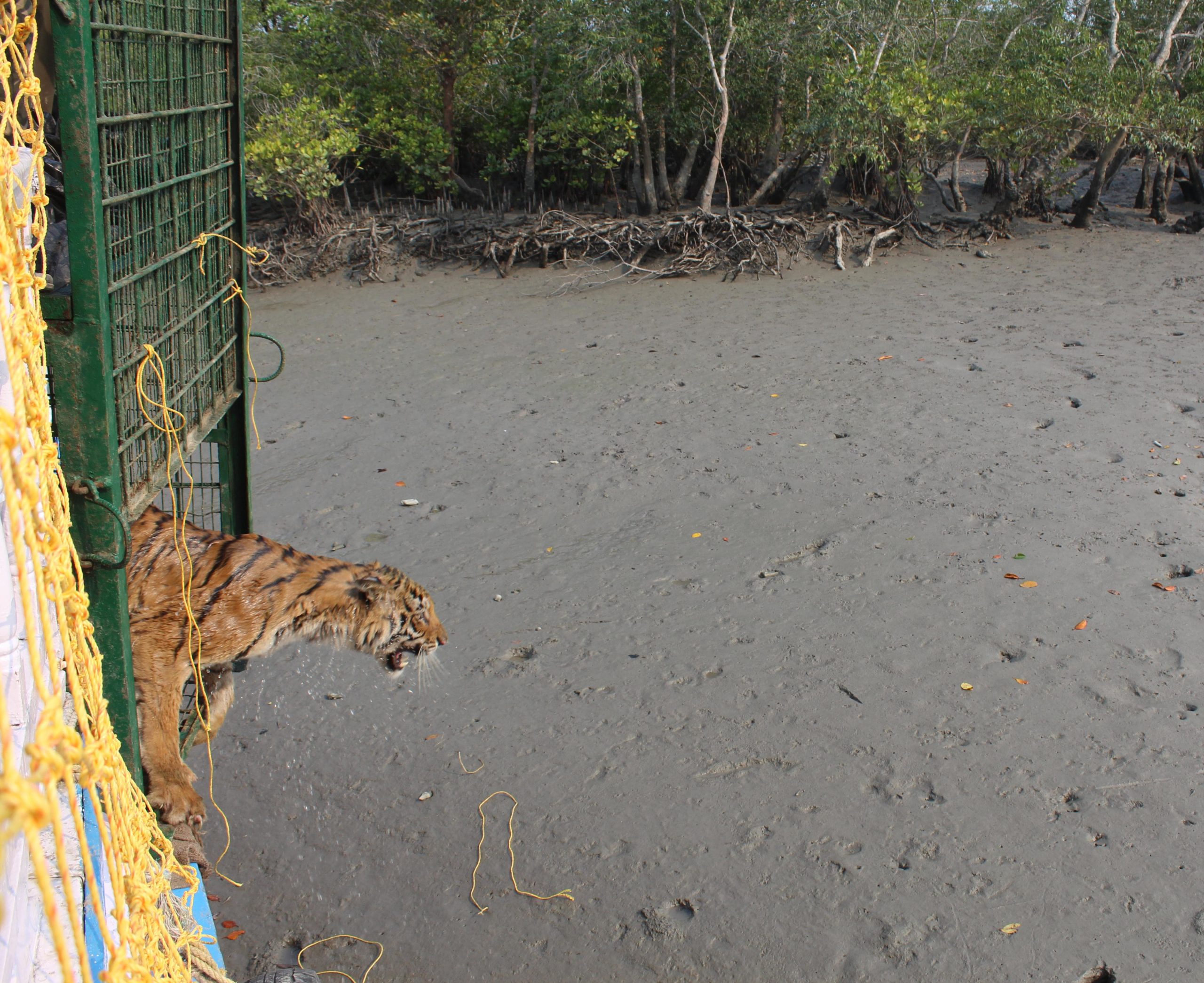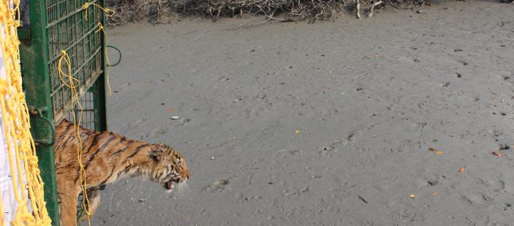 The animal had likely crossed the river locally called Orian Nulla from the adjacent Ajmalmari forest compartment, seeking refuge in the  dense patch of mangroves between the creek and the village. Upon receiving information of the tiger’s presence, the Wildlife Trust of India’s Rapid Response Team (RRT) boat and Raidighi Range Forest officials of 24 Pargana (South) Forest Division promptly mobilised a team to the area. The initial strategy was to set up  a nylon as well as steel wool net fencing around the patch of mangroves it was taking refuge in, to prevent the tiger from venturing further into the village. Despite these efforts, the tiger managed to move to another section the following day and the dense vegetation provided enough cover , making it challenging for the ground team to locate and monitor the animal. Days later the ground team, led by DFO, 24 Pargana (South) Forest Division used      controlled firecrackers to encourage the tiger to move towards the forested area by crossing the river. The main objective of this operation was to ensure the safe return of the tiger to its natural habitat while minimising stress to the animal as well as ensuring the safety of the villagers and their livestock.