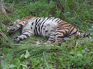 Tigers are known to prey on elephant calves but this was a rare instance when a tiger was ostensibly killed by elephants. There were no external injuries and the reason of the death was due to “abnormal rotation of the head, dislocation of the atlanto-occipetal joint and rupture of the spinal cord”.