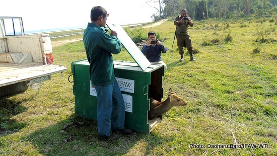 Kaziranga, January 14, 2016: After having strayed into human habitations, two hog deer were rescued, treated and released in the Kaziranga National Park by the IFAW-WTI run Mobile Veterinary Service (MVS) team at the Centre for Wildlife Rehabilitation and Conservation (CWRC) in Assam. These deer were rescued by villagers who handed them over to MVS team for further care.