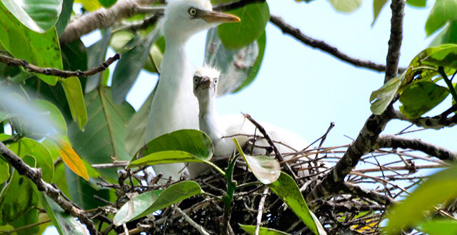 A cattle egret and its chick in their nest on the Banyan tree in village Bali