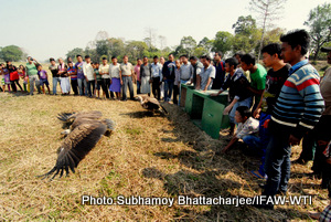 Sivsagar, February 17, 2015: A Himalayan Griffon vulture literally came back from the dead to live a new life in the wild, thanks to the never-say-die attitude of the dedicated team at the IFAW-WTI run Centre for Wildlife Rehabilitation and Conservation (CWRC). The vulture was released along with yet another rehabilitated vulture from CWRC at Sivsagar this morning, at an awareness programme in the presence of stakeholders from the village where it was found.
