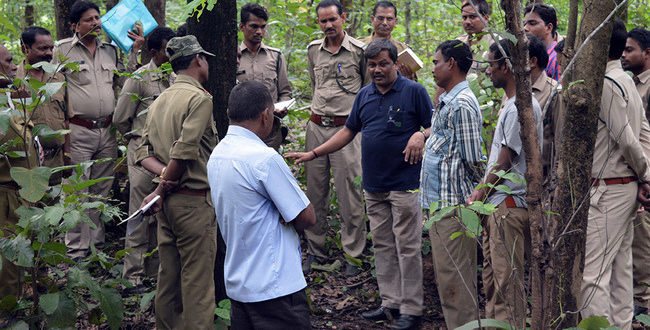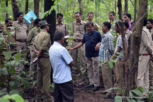Frontline forest personnel interact with trainers during a mock crime scene investigation on day two of the VRP programme at Udanti-Sitanadi Tiger Reserve