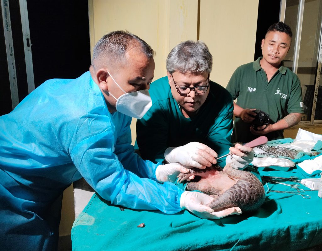 Dr Panjit and a vet team conducting Orthopaedic surgery on an injured Chinese pangolin in Arunachal Pradesh
