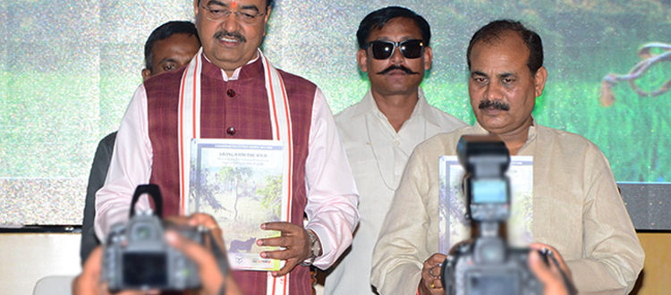Uttar Pradesh, Dudhwa Tiger Reserve, Pilibhit Tiger Reserve, Katerniaghat Wildlife Sanctuary, Pilibhit Forest Division, Dudhwa National Park, Kishanpur Wildlife Sanctuary, Conflict Mitigation, Human-Wildlife Conflict, Human-Carnivore Conflict, Tigers, Leopards, Rapid Response Teams, Primary Response Teams, Conservation Action Report“Living with the Wild”, WTI’s Conservation Action Report on mitigating conflict with big cats in the Dudhwa-Pilibhit landscape, being released by Shri Keshav Prasad Maurya, Hon’ble Deputy Chief Minister, Govt. of Uttar Pradesh (left) and Shri Dara Singh Chauhan, Hon’ble Minister of Forests, Govt. of Uttar Pradesh