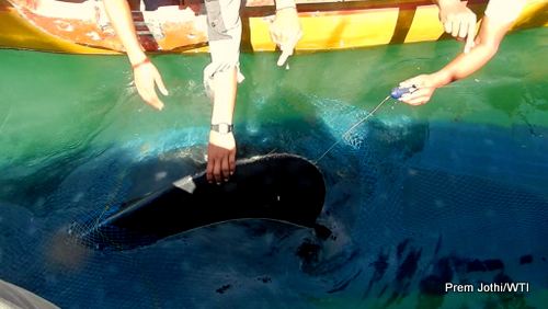 At around 10:45 am on April 1, 2015, forest officers informed WTI team that a trawl operating fisherman reported that a whale shark has been entangled in his fishing net. Soon, forest officials and Prem Jothi, Marine Biologist, WTI, reached the spot. The regional media also accompanied the forest officials to report on the rescue and tagging exercise. Once the team reached the boat, the health of the whale shark was assessed and after that the process of tag deployment was initiated. Thereafter, WTI team and the forest department officials deployed the satellite tag and the whale shark was rescued and released.