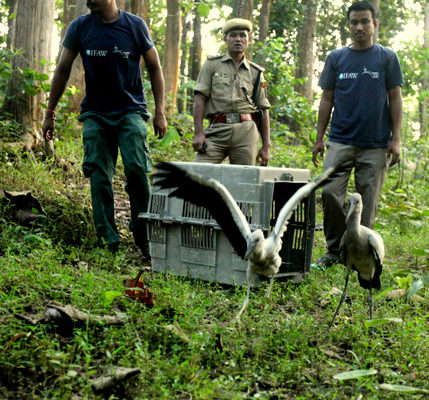 Kaziranga, September 28, 2015: Two open billed stork fledgling were released by the CWRC MVS team at Rangalu Forest beat area of Kaziranga National Park on September 28,...